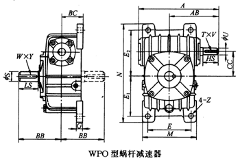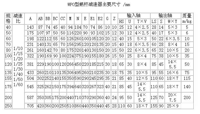 WPO40、WPO50、WPO60、WPO70、WPO80、WPO100、WPO120、WPO135、WPO155、WPO175、WPO200、WPO250、型蝸輪蝸桿減速器主要尺寸