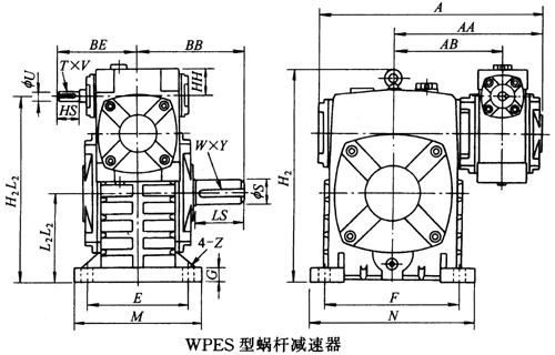 WPES40~70、WPES50~80、WPES60~100、WPES70~120、WPES80~135、WPES100~155、WPES120~175、WPES135~200、WPES155~250、型蝸輪蝸桿減速器主要尺寸